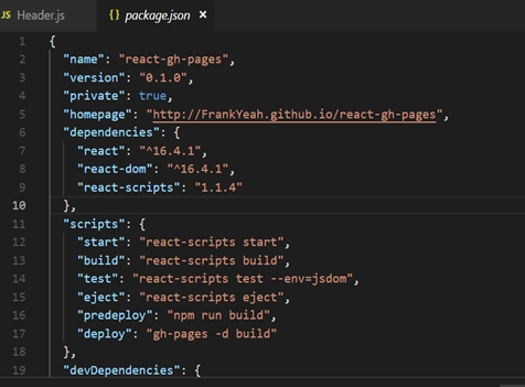 打開目錄中的package.json,新增一條: “homepage”: http://使用者名稱.github.io/倉庫名 其中的使用者名稱以及倉庫名請自行輸入。接著在scrpits中新增兩條: “predeploy”: “npm run build”, “deploy”: “gh-pages -d build”